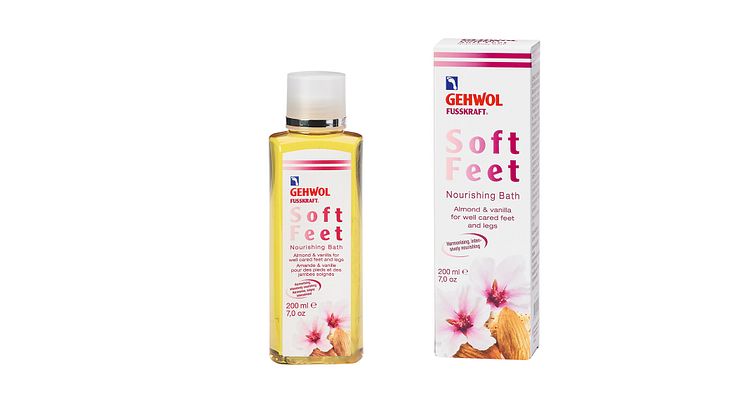 GEHWOL FUSSKRAFT Soft Feet Nourishing Bath spoils the feet and legs with an unforgettable bath experience. Immerse and gently re-lax! Your skin will feel wonderfully soft after only one bath. The bath is suitable for all skin types, especially dry and sensitive skin. Because the essence contains unique ingredients, transforming the bath into a rich, harmonising cleansing and nourishing milk. Almond oil, for instance, soothes the skin, rendering it beautifully soft and protecting it. We also added seductive vanilla, which - together with Vitamin E as well as care oils of avocado and castor - lends plenty of moisture, softens callus, and brings out a smooth, vital skin appearance. GEH-WOL FUSSKRAFT Soft Feet Nourishing Bath contains a surfactant developed especially for sensitive skin. It ensures that the contained care oils are evenly distributed in the water. This produces a milky, shimmering, pleasantly scented emulsion which intensively supplies moisture and protects the skin flora.